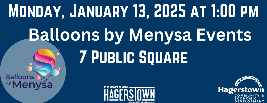 Business owner, Tameeka Mitchell, a native of Brooklyn, NYC, has been living in Hagerstown for the last decade and has grown her business from a home-based business into the first of its kind balloon bar boutique shop on the square in downtown Hagerstown. Having earned several Balloon Artist and Event Designer certifications, Ms. Mitchell is an alumni of The Incubator at Hagerstown Community College, a member of the Chamber of Commerce, and award winner of Hagerstown Startup Week Business Pitch competition. The name Menysa, a unique blend of her children’s names, was born in New York city in 2003. Join the City of Hagerstown to celebrate the grand opening of a new era in balloon décor in Hagerstown!