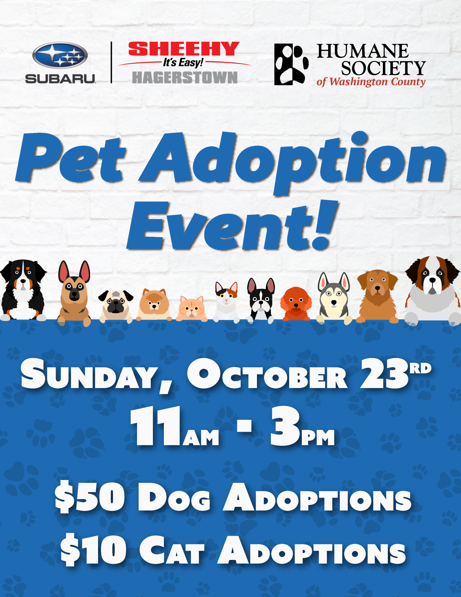 The Humane Society of Washington County (HSWC) will be partnering with Sheehy Subaru Hagerstown for the 9th Annual Subaru Loves Pets Adoption Event on Sunday, October 23 from 11 am to 3 pm. The event will be held at Sheehy Subaru, 10310 Auto Place, Hagerstown. This year, dog adoption fees are $50 and cat adoption fees are $10. Animals available at the adoption event are able to go home with their new families that day.