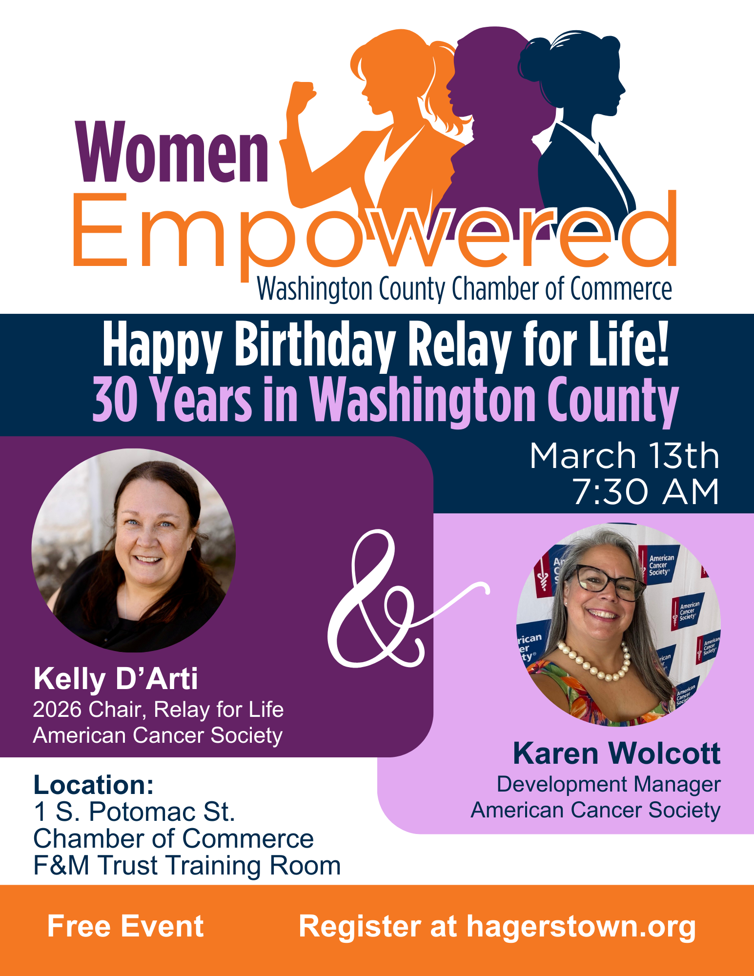 Karen Wolcott is the Staff Partner for both Washington and Frederick Counties in Maryland. Starting her 4th year with the American Cancer Society, Karen is responsible for making community connections that support the mission of the American Cancer Society “to end cancer as we know it for everyone”. Karen works with volunteers, cancer patients, caregivers, survivors/thrivers, the local medical community as well as community partners and fundraisers who feel called to help us reach our goals. It all started back in 2009 when her last child went back to school full time and she needed to find a job that was flexible to her children’s school schedule. She began to work for Frederick County Public Schools, and the team of coworkers introduced her to the Relay For Life and she has been a volunteer ever since. In Feb 2023, Karen had the opportunity to apply to work for the American Cancer Society where she now runs the 2nd and 3rd largest Relay For Life events in the State of Maryland and is starting a brand new event at Fort Ritchie in Cascade, MD called Climb to End Cancer where participants will be hiking the Site C mountain logging trails and celebrating afterwards on the parade grounds in September of 2026.