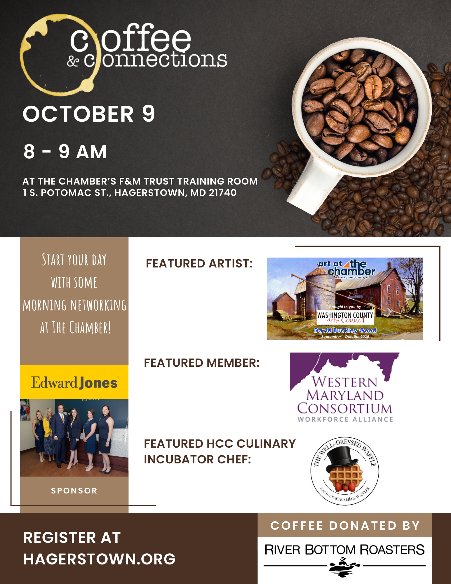 Coffee & Connections: A morning event where chamber members are selected to speak about their organization along with an incubator chef with samples, and surrounded by art by local artists affiliated with the Washington County Arts Council.